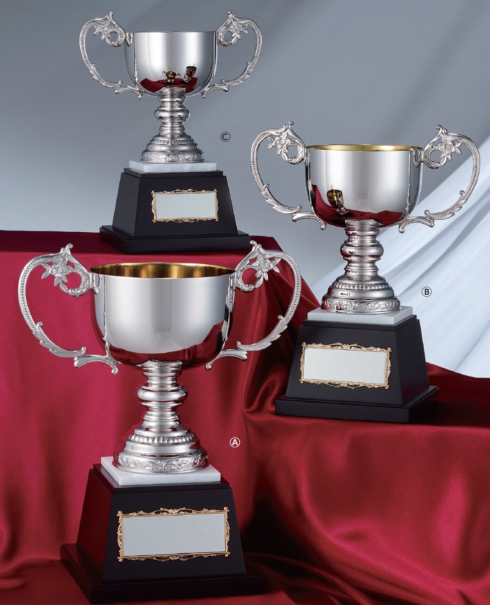 伝統的に杯型の金属製で、台座に大会名や受賞者名が刻まれ、