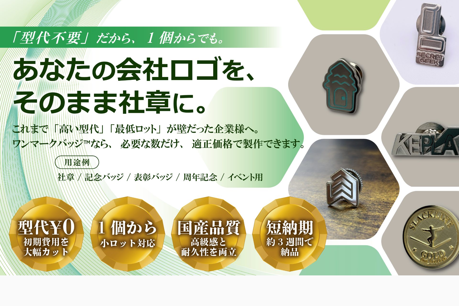 これまで社章は型代が高く、少量では難しいと諦めていました。ワンマークバッジ™は社章を型代不要・小ロットで製作できるので、創業記念で社員全員に配布できました。仕上がりも精密で大満足です。